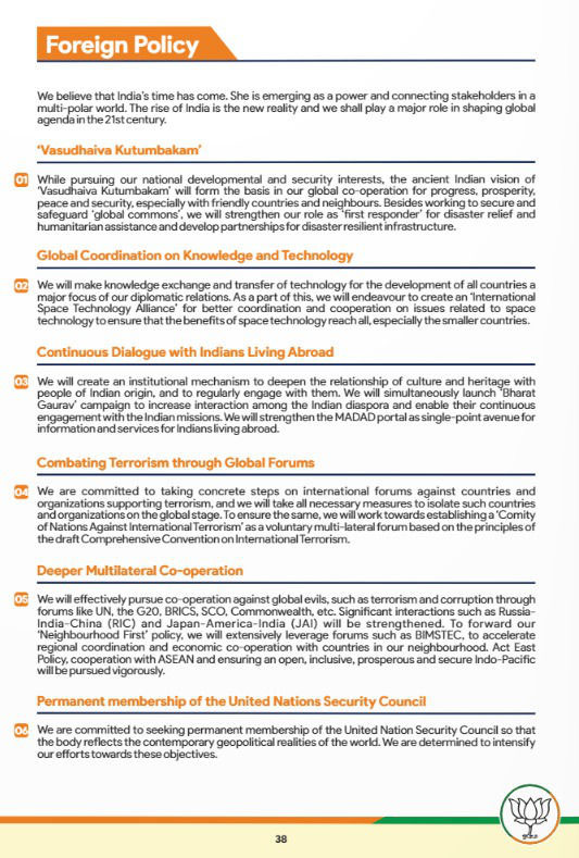 PM Modi in the manifesto says: “International relations are based on mutual understanding and cooperation.”